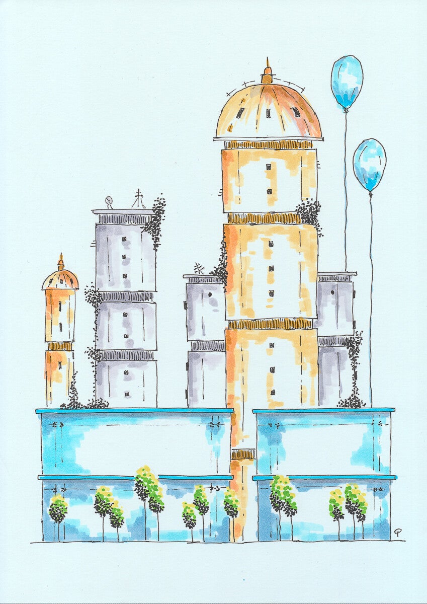 Deze tekening is gemaakt met fineliners en stelt allemaal oude, bekende gebouwen van Wuustwezel voor.